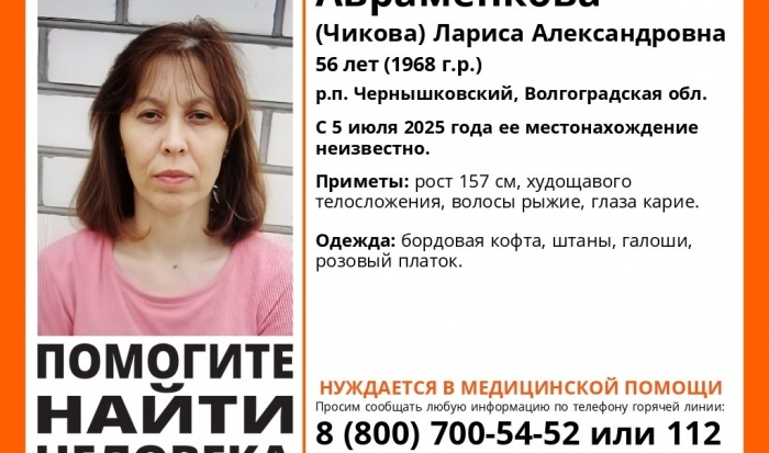 Женщина ушла из дома накануне, и до сих пор волонтеры занимаются ее поисками. В минувшую субботу, 5 июля, в рабочем поселке Чернышковском Волгоградской области пропала местная жительница, 56-летняя Лариса Авраменкова (Чикова). С этого времени о ее местонахождении ничего не известно. Согласно приметам, указанным поисково-спасательным отрядом «ЛизаАлерт», рост пропавшей составляет 157 см. У нее худощавое телосложение, рыжие волосы и карие глаза. В день исчезновения была одета в бордовую кофту, штаны, галоши и розовый платок. Всех, кто знает что-либо о местонахождении женщины, просят обратиться по телефонам: 8 (800) 700-54-52 или 112.