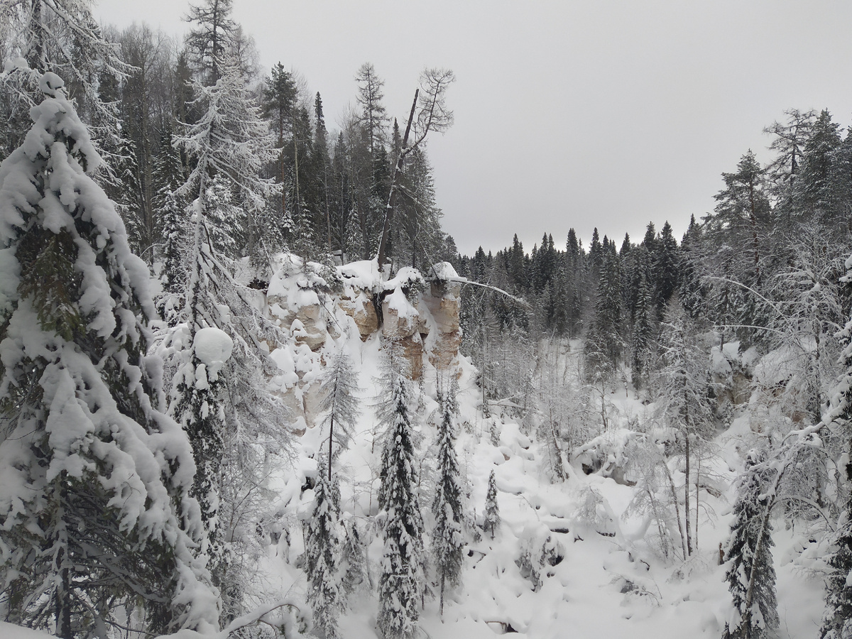 Казалось бы утро, еще можно спать и спать, восстанавливая свой трудовой потенциал. Но любопытство, совместно с желанием путешествовать записались на экскурсию в пещеру Пинежья. Лень была против! «Мокро», говорила она, «а если не мокро, то сыро, холодно и грязно». Но я все равно поехала. И вот, 11 утра наш автобус приезжает на базу Голубино. Всем новоиспеченным спелеологам выдают каски, фонарики и одного опытного предводителя группы, который знает куда идти. Идти нам предстояло в пещеру с интересным названием «Певчая эстрада». Тропа уходит от автодороги не далеко, метров 150-200. Сначала сворачиваем на край обрыва, с которого открывается шикарный вид на бело-красные карстовые породы, вырывающиеся из земли и образующие отвесные стены. На самом краю обрыва стоит сосна. К ней идет хорошо натоптанная тропинка, заканчивающаяся не менее хорошо утрамбованным пятачком с удачным ракурсом для фото. Но, так как, «а Баба Яга против» я нашла себе другую елку и, проваливаясь в снег по колено, дополз