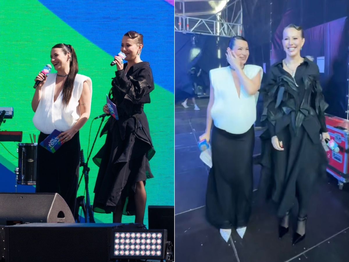 5 и 6 июля масштабный фестиваль, посвященный музыке, прошел в Санкт-Петербурге. Море звезд съехалось в город на Неве: от легенд до поющих тиктокеров. Ведущими стали Ксения Бородина и Ида Галич, которая находится уже на последнем месяце беременности. Очень интересные образы показали как ведущие, так и артисты. Ведущие за 2 дня сменили несколько нарядов. Сначала Ксения была в total black что-то в стиле бохо с воланами и бантами. На Иде черно-белый лук от Autentiments: боди и юбка. Юбка под животом выглядит странно, но на таком сроке беременности уже трудно подобрать одежду, живот ничем не замаскировать. Следующие выходы были от Viva Fox у обеих ведущих: на Иде жакет оверсайз с черным комбинезоном, на Ксении - юбка с пышным воланом, которую уравновешивала блуза по фигуре. И вот тот образ, который идеально подходит всем беременным - с объемным жакетом. Блестящие полосы поддерживают нити ожерелья. Следующий выход Собчак был в корне противоположным: в соблазнительном кружевном боди, юбке с а