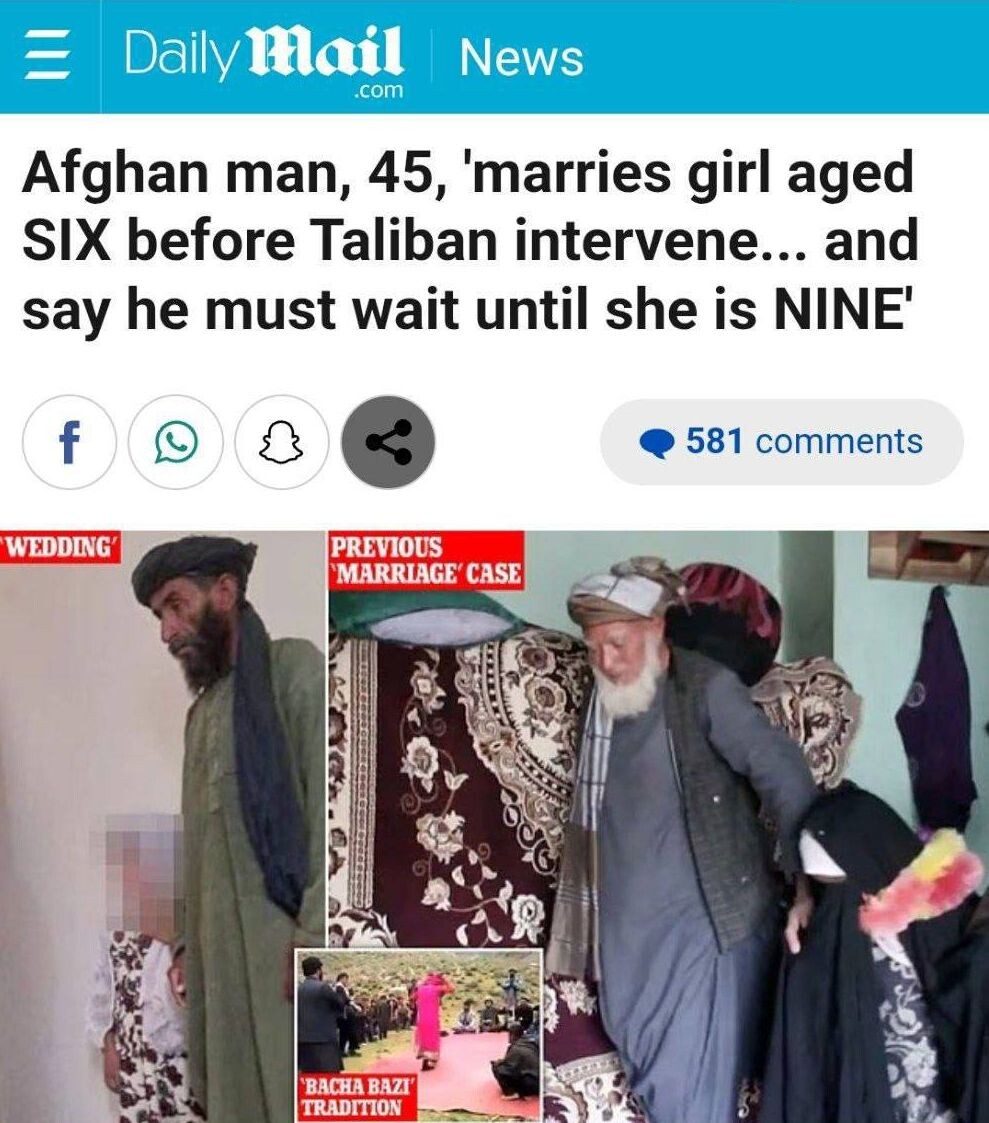 В Афганистане 45-летний мужчина пытался жениться на 6-летней девочке, но власти запретили на том основании, что в этом возрасте девочкам еще нельзя заниматься сексом.