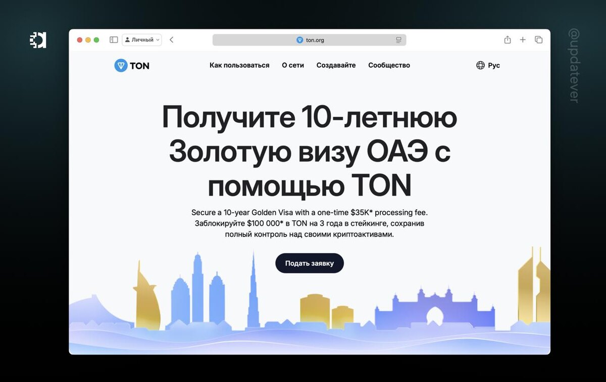 🚗Виза в ОАЭ за TON Если вы «заморозите» $100 000 в TON на три года, а также выплатите комиссию в размере $35 000, то сможете получить золотую визу в ОАЭ. Помимо вас виза будет вручена и вашей семье. В течении трех лет деньги нельзя будет потратить, однако они будут расти под 3-4% в год. ⚡️ Подписаться.