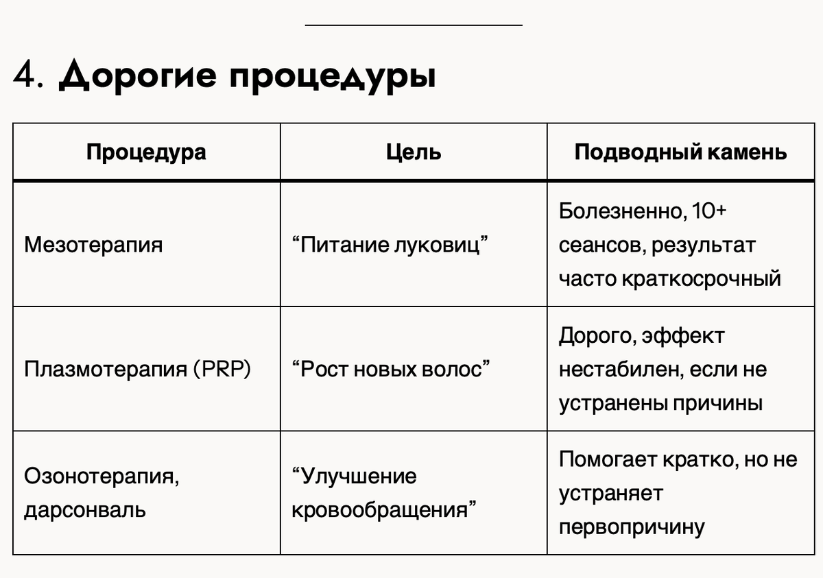 А уходит — с пакетом анализов, банкой БАДов, направлением на процедуры и длинным счётом. Почему так происходит? Это система, и вот как она устроена. 📍И очень часто трихолог работает на процентах от продаж: 🔍 Признак: список анализов копипастный, не учитывает пол, возраст, образ жизни 💬 Реально: трихоскопия — вспомогательный метод, а не диагноз. И “пустая луковица” может быть нормой. ⚠️ Реально: витамины без дефицитов могут ухудшить ситуацию (например, передоз железа = выпадение) 💸 Стоимость: 3 000–10 000 ₽ за сеанс. Часто — пакетом по 5–15 штук. 📍 Трихолог имеет процент от проданных процедур. 🎯 Продаются как “обязательная часть лечения” 📍 Признак: диагноз не ставится на первом приёме, нет рекомендаций до анализов