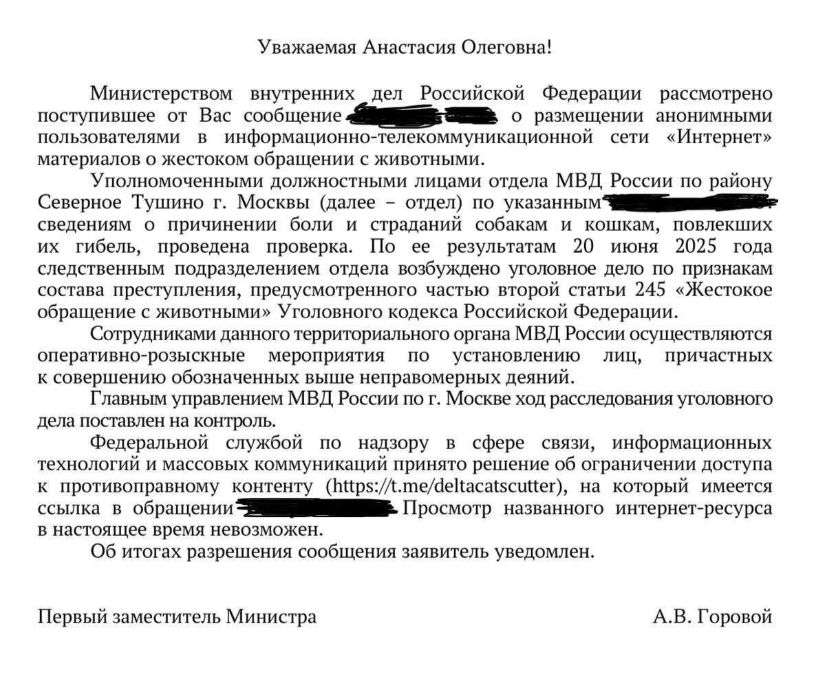 Согласно сообщению МВД, на основании направленных Анастасией Удальцовой сведений было возбуждено уголовное дело по статье о жестоком обращении с животными, а садистский Telegram-канал — заблокирован. Преступников разыскивает полиция.