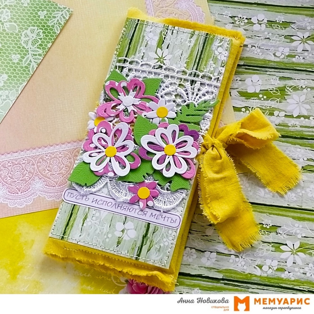 Всем привет! С вами Анна Новикова. Сегодня я хочу поделиться процессом изготовления тканевой шоколадницы, которую я выполнила по вдохновению от нашей новой летней палитры. Вот такая яркая и солнечная она у меня получилась. Итак, начнём с материалов и инструментов, которые я использовала в работе. Материалы: х/б ткань размером 30 * 19 см; из этой же ткани для завязки полоска примерно 60 * 2,5 см; 2 листа скрапбумаги от LemonCraft; пара карточек из этой же коллекции; белый, жёлтый и розовый кардсток; ножи из наборов «Синематограф» и «Подарочные бантики» от AgiArt; белое кружево; нитки; клей. Инструменты: канцелярский нож, металлическая линейка, ножницы, швейная машинка, машинка для вырубки, доска для биговки. С помощью канцелярского ножа и металлической линейки вырезала из зелёного листа скрапбумаги 4 элемента для фона: два размером 8 * 17 см, один - 5 * 17 см и один - 4 * 17 см. На приготовленный кусок ткани разложила и слегка прихватила клеем (так, чтобы он не просочился сквозь ткань)