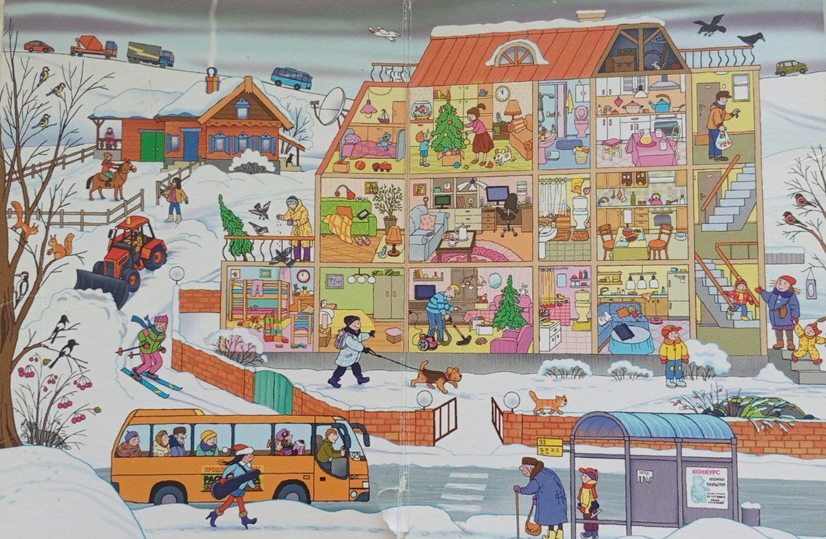 1) Сколько человек живёт на каждом этаже? 2) Найти часы и ответить на вопрос: "Который час?" 3) Найдите трёх кошек. #занимательные_картинки #внимательность #логика