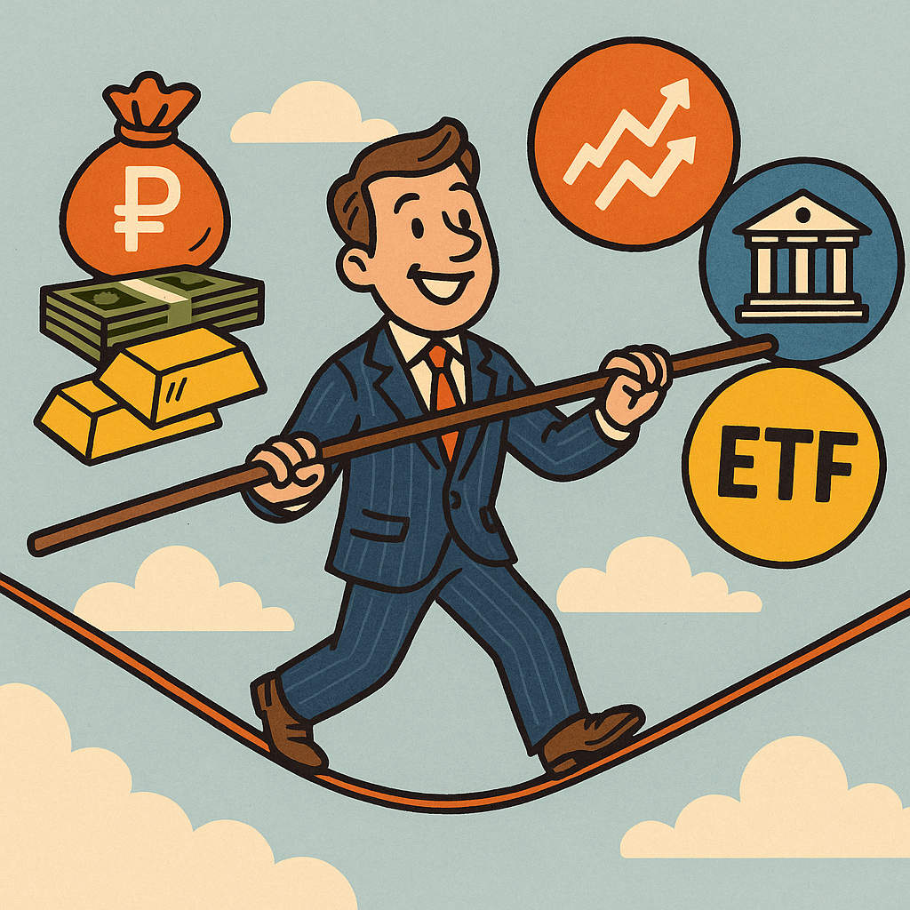 Многие новички думают: «Возьму Сбер, Газпром, МТС — и достаточно». Да, это надёжные голубые фишки. Но даже они не защищают от просадок, если все из одного сектора или все сильно зависят от одной экономической политики. 📌 Решение — сбалансированный портфель, где голубые фишки — это лишь фундамент. А рядом — облигации, валюта, фонды или даже металл. Это такой портфель, в котором: