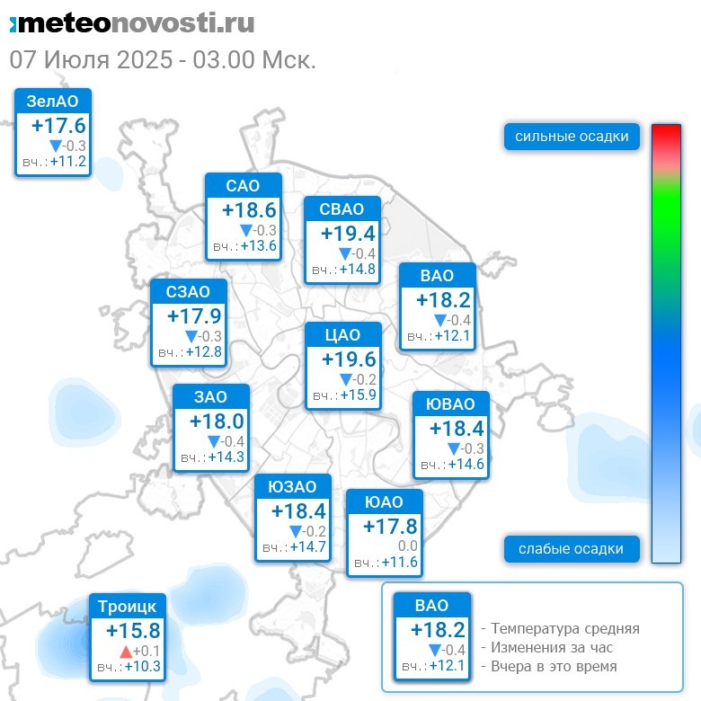 В 3:00 в Москве было от +16.1°C до +19.8°C, средняя температура +18.3°C #погода #Москва #лето #температура #7июля #понедельник