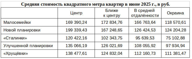 Но погоду на рынке всё-таки определяли не они, а квартиры новой планировки. Ближе к центру дороже стали запрашивать за такие двухкомнатные квартиры на 8,9%, в средней отдалённости за одно- и двухкомнатные соответственно на 20,2% и 12,6%, а на окраинах за одно- и трёхкомнатные — в среднем на 8%. В центре одно- и трёхкомнатные квартиры новой планировки стали дороже в среднем на 6,1%. При этом большие трёхкомнатные здесь подорожали аж на 10,7% и предлагались на продажу по средней цене 17 миллионов 770 тысяч рублей. Рекордная цена в июне принадлежит 4-комнатной квартире общей площадью 197 квадратных метров на 18-м этаже 23-этажного дома на улице Кавказской с ценой 54 миллиона 700 тысяч рублей.