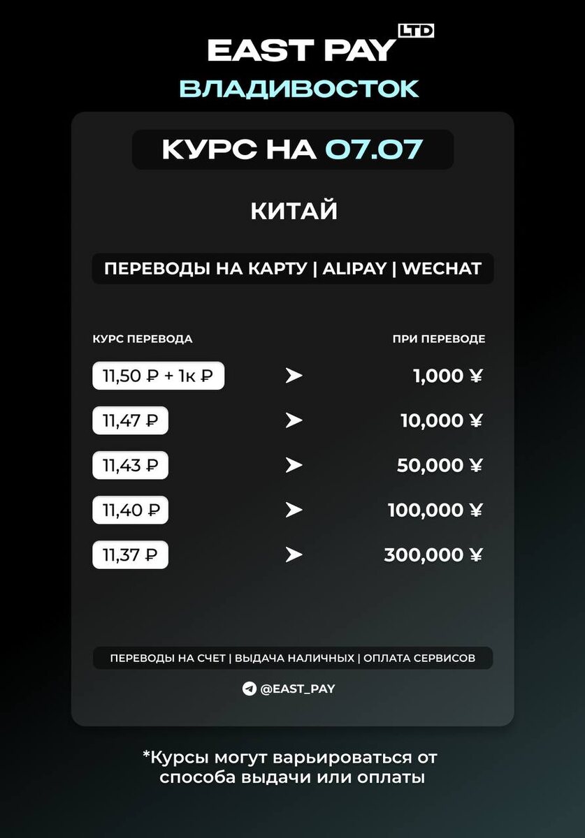 КУРСЫ НА КИТАЙ 💙Переводы на китайскую карту 💙Alipay / Wechat 🔘В течение дня курс может меняться. Рекомендуем уточнять актуальный курс у менеджера. ❗️ВАЖНО: мы получили лицензию и открыли офис в Корее. Подробности можете узнать у менеджера. 🔴🔴🔴🔴🔴🔴🔴🔴🔴🔴 🟠Написать менеджеру: @east_pay_world 🟠Сделать просчет самостоятельно в боте: @East_PaySer_bot ✈️ Подписаться на «East Pay»