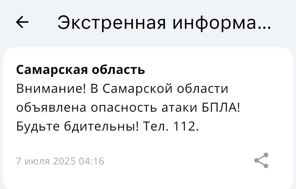⚡️В Самарской области объявлена опасность атаки БПЛА