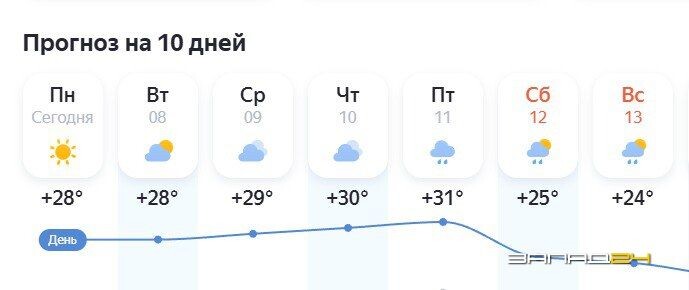 🌦К концу жаркой рабочей недели свежесть в центральные и южные районы края принесут дожди Начавшаяся рабочая неделя в центральных и южных районах Красноярского края будет жаркой, но в большинстве своем пасмурной. В понедельник еще преимущественно ясно. Днем столбик термометра поднимется до +27 градусов. Ветер восточный со скоростью до 5 м/с. Осадков в течение дня не ожидается. В ночь на вторник по-летнему тепло: +19 градусов, на небе тоже ясно. А вот днем во вторник облаков станет больше, к вечеру и вовсе станет хмуро, но без осадков. Воздух прогреется до +27 градусов, ветер тот же восточный со скоростью 4-5 м/с. Среда и четверг будут пасмурными. По данным погоды на Яндекс, средняя температура воздуха днем составит в пределах +28 градусов. Направление ветра изменится на сначала на с/в, а затем будет дуть с западной стороны, правда, не сильно, скорость ветра составит около 3 м/с. В пятницу еще жарче. Синоптики обещают +31 градус, но уже с дождем. Осадки будут наблюдаться в течение
