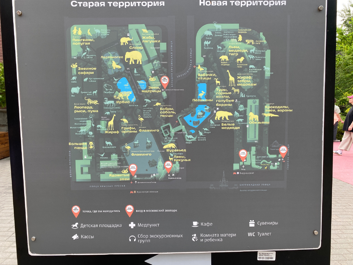 Московский Зоопарк - это то место, где можно провести целый день, так как территория Зоопарка просто огромная. Но при входе можно сфотографировать подробную карту и 2ГИС, конечно же, в помощь. Что касается входа в Зоопарк, то билеты мы оформляли по льготным документам, и это заняло буквально пять минут, очередей при входе не было. Билет выдается на каждого члена семьи и напоминает обычный чек. Мы попали в Зоопарк в жаркий субботний день, и нам пришлось столкнуться просто с огромным количеством людей. Были мы в Зоопарке 28.06.2025 года. Особенно это ощущалось при переходе «со старой территории на новую территорию». Были очереди к вольерам с животными, так например, чтобы посмотреть белого медведя, надо было «выдержать чуть ли не давку». Ну и следует отметить тридцати минутную очередь в женский туалет. Теперь перейдем к плюсам: на территории Зоопарка можно увидеть и киоски с сувенирной продукцией, и продуктовые кафе-магазинчики. Лично мы приобрели довольно симпатичный деревянный магни