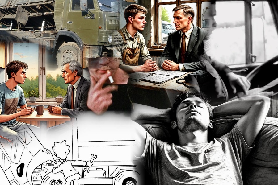 Движок завёл, давление прибор показал, немного дал ему поработать, заглушил, до уровня немного масло долил. Начал шприц набивать, «Литол» бесит, жирный скользкий, в шприц лезть не хочет. Под КамАЗ залез, то тавотница не пробивается, то наконечником попасть не могу, головой об ресивер ударился. Короче всё из рук валиться, кое-как смазку закончил. Вылез уже из под прицепа, всё раздражает и бесит. Ещё что-то делал, почти не соображая. Мысли друг, через дружку перескакивают, время уже конец рабочего дня. Скоро домой, а там и Михайлович заявиться и мне надо будет ему ответ дать, а какой я так и не решил.