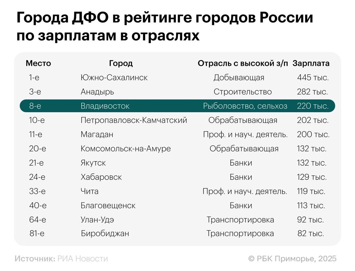 🤑 Южно-Сахалинск занял первое место в России по размеру средней заработной платы по отраслям Самой высокооплачиваемой здесь оказалась работа в сфере добычи полезных ископаемых со средней зарплатой 445 тыс. руб. в месяц. Замыкает первую тройку лидеров Анадырь с высокими зарплатами в строительстве — 282 тыс. руб. Владивосток также вошел в десятку крупнейших городов страны по уровню отраслевых зарплат — 8 место. В столице Приморья самые высокие доходы — в сфере рыболовства, сельского и лесного хозяйства: 220 тыс. руб. в месяц. 😃Подписывайтесь на РБК Восток