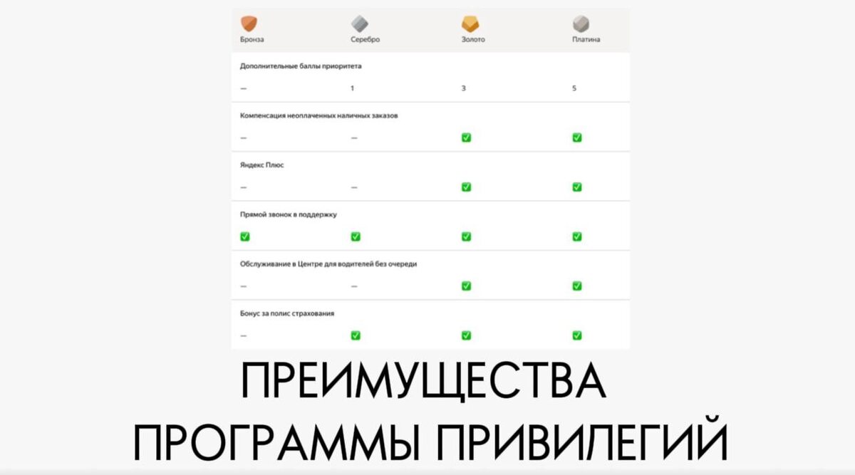 Программа привилегий даёт водителям дополнительные бонусы, приоритет в заказах и поддержку сервиса. Ваш уровень зависит от количества баллов за месяц. 🔹 Какие уровни бывают? 💎 Платина — 10 000 баллов (рейтинг от 4,9) 🥇 Золото — 8 000 баллов (рейтинг от 4,8) 🥈 Серебро — 3 000 баллов 🥉 Бронза — 300 баллов Чем выше уровень — тем больше привилегий! 🔥 Преимущества программы: ✅ 🔹 Страховая защита: • Участники программы «Защита дохода при болезни» могут получить выплаты, если выйти на линию не получится из-за болезни или несчастного случая. • Полная стоимость полиса возвращается всем участникам программы с уровнями Золото и Платина, а также самозанятым и водителям-ИП с уровнем Серебро. • 50% стоимости полиса возвращается парковым водителям с уровнем Серебро. ✅ 🔹 Подписка «Яндекс Плюс Мульти» • Доступно на уровнях Золото и Платина. • Бесплатные фильмы, музыка, кешбэк в сервисах Яндекса. • Можно подключить всю семью. ✅ 🔹 Компенсация за неоплаченные заказы наличными: • Доступно на