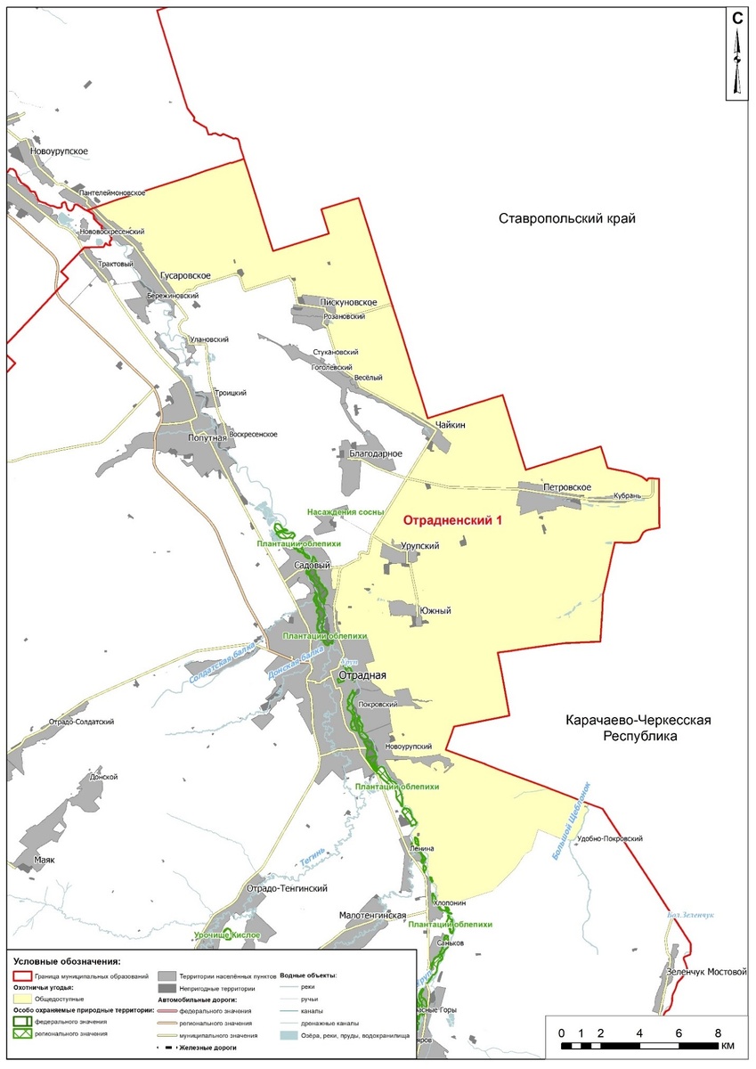 Охотничье угодье "Отрадненский 1" Границы охотничьего угодья: Северная: от исходной точки с координатами 44.619298° с.ш., 41.382230° в.д. в восточном направлении по границе Отрадненского района до точки с координатами 44.618486° с.ш., 41.551722° в.д. Восточная: от точки с координатами 44.618486° с.ш., 41.551722° в.д. в юго-восточном направлении по границе Отрадненского района до балки Рысакон. Южная: от места пересечения балки Рысакон границей Отрадненского района в юго-западном направлении по балке Рысакон до внутрихозяйственной дороги в точке с координатами 44.319320° с.ш., 41.670149° в.д., далее в северо-западном направлении по внутрихозяйственной дороге до перекрестка в точке с координатами 44.325175° с.ш., 41.648754° в.д., далее в юго-западном направлении по внутрихозяйственной дороге до точки с координатами 44.293612° с.ш., 41.595433° в.д., далее в юго-западном направлении по прямой линии до реки Уруп в точке с координатами 44.291294° с.ш., 41.583172° в.д. Западная: от точки с ко