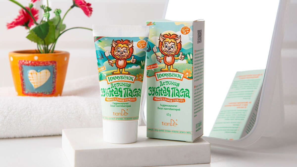 Чистка зубов у детей – очень важная процедура, которая формирует правильные привычки к гигиене и предотвращает кариес. Когда начинать? Какие средства выбирать? Обо всем – дальше. 1. Когда начинать? 2. Какую щетку и пасту выбрать? 3. Детская зубная паста Kids 3+ «Минеральная защита» Безопасная формула, без фтора, SLS, парабенов – детская зубная паста от TianDe содержит активные компоненты в «детской» дозировке. Она сделана на Алтае – в одном из самых экологически чистых мест планеты. Благодаря мягкому современному абразиву, гидроксиапатиту, лизатам лактобактерий и 7 травяным экстрактам зубная паста детская от TianDe обладает высокой очищающей способностью и обеспечивает комплексный уход, а также: 4. Техника чистки 5. Как заинтересовать ребенка? 6. Дополнительные советы 7. Чего избегать в детской гигиене? Если ребенок сопротивляется, проявите терпение – со временем чистка зубов станет привычкой. А привить ее быстрее поможет веселый герой «Иммувенок» из детской коллекции TianDe!