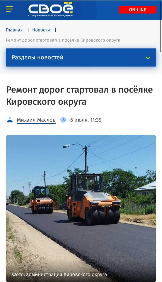 #КировскийокругвобъективекраевыхСМИ Ремонт дорог стартовал в посёлке Кировского округа К работам приступили на улицах Заречной и Красной. В посёлке Золка Кировского округа приступили к ремонту автомобильных дорогна улицах Красной и Заречной. На эти цели направили 19,4 млн рублей. Это позволит привести в порядок более 1,5 км дорог. Сейчас подрядчик выполняет работы по укладке первого слоя асфальтового покрытия, работы ведутся с опережением графика. Об этом в воскресенье, 6 июля, сообщили в управлении пресс-службы и информполитики губернатора и правительства Ставропольского края. «Всего в округе в этом году в рамках программы запланирован ремонт более 10 км дорог, что станет значительным вкладом в развитие дорожной инфраструктуры округа, — отметил глава муниципалитета Николай Новопашин. Ранее губернатор Ставрополья Владимир Владимиров поручил заблаговременно готовиться к ремонту дорог.