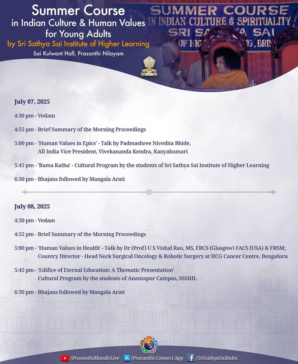 Летний курс по индийской культуре и общечеловеческим ценностям для молодых людей от Института высшего образования Шри Сатья Саи Саи Кульвант Холл, Прашанти Нилаям Расписание программы: 7 июля 2025 г. 16:30* - Веды 16:55 - Краткое резюме утренних слушаний 17:00 - Общечеловеческие ценности в эпосах - выступление Падмашри Ниведиты Бхиде, вице-президента по всей Индии, Вивекананда Кендра, Каньякумари 17:45 - "Рама Катха" - Культурная программа от студентов Института высшего образования Шри Сатья Саи 18:30 - Бхаджаны и Мангала Арати 🪷 8 июля 2025 16:30 - Веды 16:55 - Краткое резюме утренних слушаний 17:00 - «Общечеловеческие ценности в здоровье» - выступление доктора (проф.) У. С. Вишала Рао, MS, FRCS (Глазго), FACS (США) и FRSM; Руководитель по стране - Хирургическая онкология головы, шеи и роботизированная хирургия в Онкологическом центре (HCG Cancer Centre), Бангалор 17:45- "Здание вечного образования: тематическая программа". Культурная программа студентов кампуса Анантап