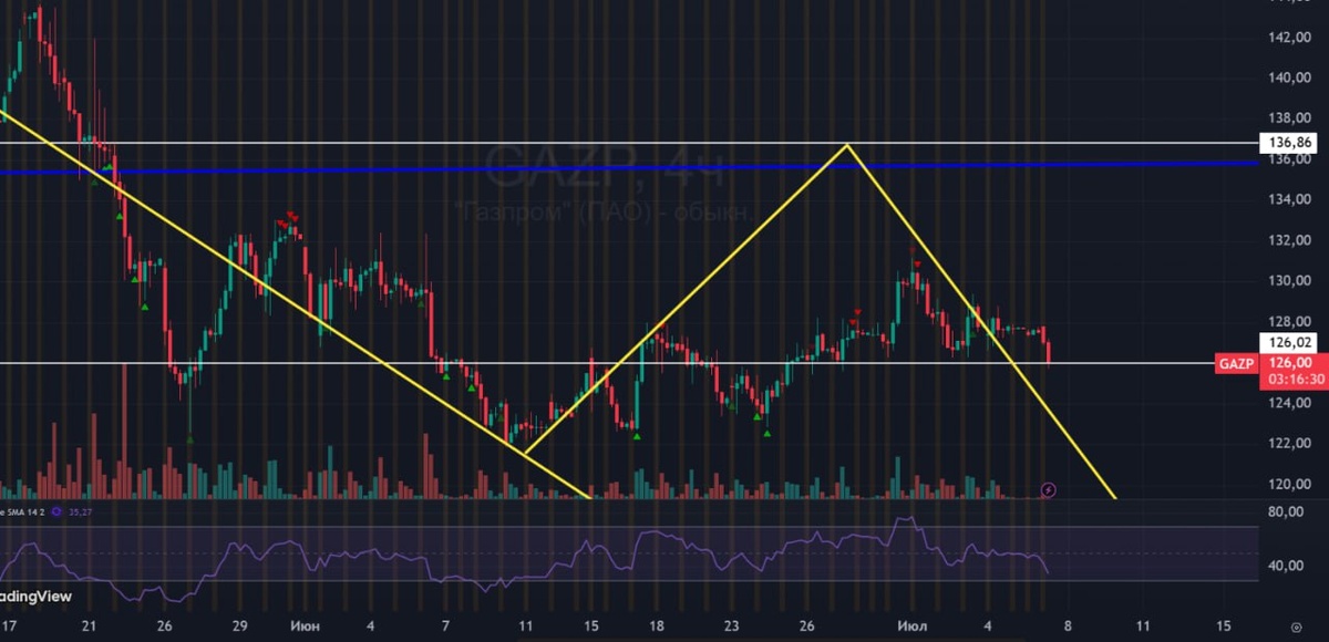 ⛽️ #ГАЗПРОМ #GAZP #bogdanoffinvest 🟢 Максимальный отскок, который я здесь предполагал, мог быть до 136. Думаю он завершен, так как цена снова притянулась к поддержке 126 руб. Стратегически жду Газпром ниже, но без лебедей он сильно вниз не пойдет. Пока что с мая стоим в боковике