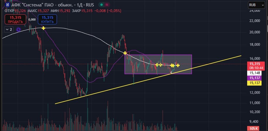 $AFKS 🕯Пока что цена двигается в небольшом боковике от 16,62 до 14,05, сказать точно куда выйдет цена из такого боковика крайне сложно, но я предполагаю, что если общее движение рынка вниз продолжится, то и АФК система полетит вместе с ними. 🔽Сильный уровень поддержки и 14,3 , как только пробьет, увидим падение, вероятнее всего, пойдём до последнего минимума 11,72. 🔼Если пробьем 16,06, тогда движение вверх продолжится и сформируется разворотная фигура. Но пока что о повышении цены говорить рано. НЕ ИИР #теханализ #инвестиции #афк #трейдер