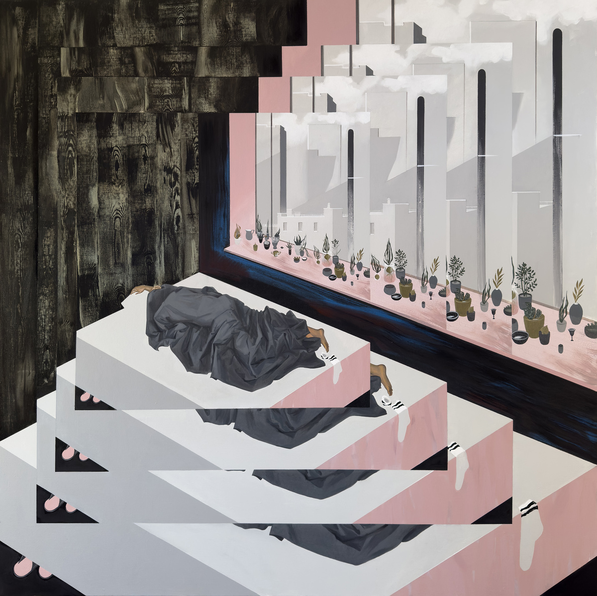 Картина Анастасии Сасовой «Сон во сне» дала название одноименной выставке, которая проходит сейчас у нас в галерее. Именно этот холст наилучшим образом репрезентует главный принцип сюрреализма – это нелинейность и нелогичность, будто все происходящее – симуляция или сновидение. Человек прячется под одеялом от реальности, размноженной как «окно» на экране компьютера. Будто система выдает ошибку и требует решения. Художница через незамысловатый сюжет показывает бессознательное повторение ежедневной рутины, и мы узнаем здесь себя. «Сон во сне» – это метафорический рассказ Анастасии о механистичности и предсказуемости человеческих будней, а также о том, как важно вырываться из этого замкнутого круга, чтобы не «зациклиться». Анастасия Сасова. Сон во сне. 2024