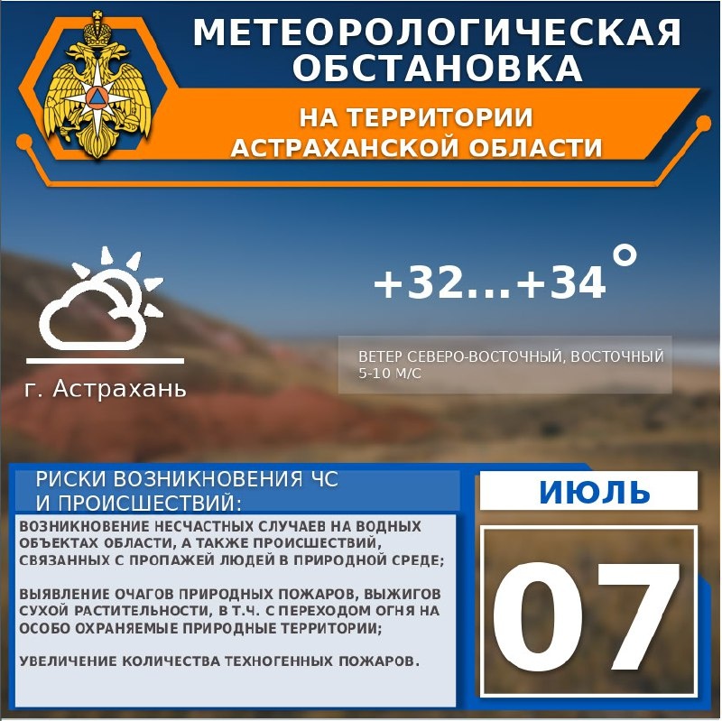 🌏Метеорологическая обстановка на 7 июля. 🌤На территории области небольшая облачность. Без существенных осадков. Ветер🌬 северо-восточный, восточный 5-10 м/с.Температура воздуха днем +30...+35°, ночью +17...+22°🌡. 🏖По г. Астрахань небольшая облачность☀️. Без существенных осадков. Ветер северо-восточный, восточный 5-10 м/с. Температура воздуха днем +32...+34°, ночью +20...+22°🌡