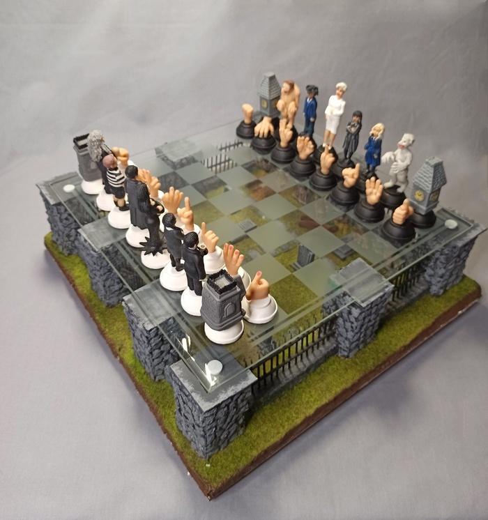 Тематические шахматы по полнометражному фильму "Семейка Аддамс" и 1 сезону сериала "Венздей". Фигуры сделаны из цветной полимерной глины. Я принципиально не крашу шахматные фигурки, так как они постоянно находятся у игроков в руках, отчего краска трескается и скалывается. Цветной же материал избавлен от недостатков краски и сохраняет яркость долгие годы. Шахматное поле сделано из закалённого стекла. Если такую доску положить на стол, то выглядеть это будет просто. Поэтому подставка для шахматной доски сделана в виде диорамы, на которой "построено" кладбище. В качестве материалов для нее я выбрала классический папье-маше, дерево, керамическая плитка, искусственная трава, самоотвердевающая полимерная глина для надгробий и смекалка. Все покрашено акрилом и покрыто специальным лаком с защитой от УФ.