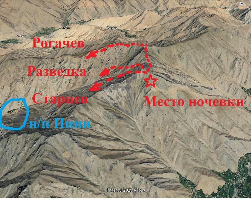 Бойцы Второго взвода с угрюмыми от досады рожами помогли друг другу обвешаться вещмешками, затем левой ножкой – топ, правой ножкой – шлёп. Как-то потопали, пошлёпали, где-то бочком, где-то рачком (на подъёме как правило). Поматюгались в полголоса, но двинулись мало по малу в сторону ущелья Пини, огибая отметку 4 005.