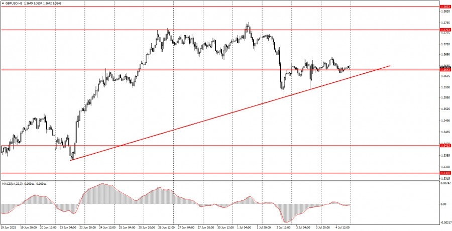https://basechop.ru/wordpress/?p=49520 Разбор сделок пятницы: 1Н график пары GBP/USD. Пара GBP/USD в пятницу показала лишь тотальный флэт и низкую волатильность. Как и в случае с парой EUR/USD, новости в этот день отсутствовали, макроэкономических публикаций не было ни одной ни в Великобритании, ни в США. В Америке отмечался День независимости, поэтому все фондовые и валютные площадки были закрыты. Как мы и предупреждали, пятница стала полу-выходным днем. 5M график пары GBP/USD. На 5-минутном ТФ в пятницу был сформирован один торговый сигнал, и его даже можно было отработать. Цена на европейской торговой сессии(когда были надежды хоть на какое-то движение) дважды отскочила от уровня 1,3682, и в течение той же сессии опустилась к области 1,3643-1,3652, где и провела остаток дня. Вряд ли имело смысл открывать короткие позиции, зная, что волатильность будет на нуле, но все же этот торговый сигнал позволял заработать около 20-25 пунктов. Советуем ознакомиться с другими статьями автора