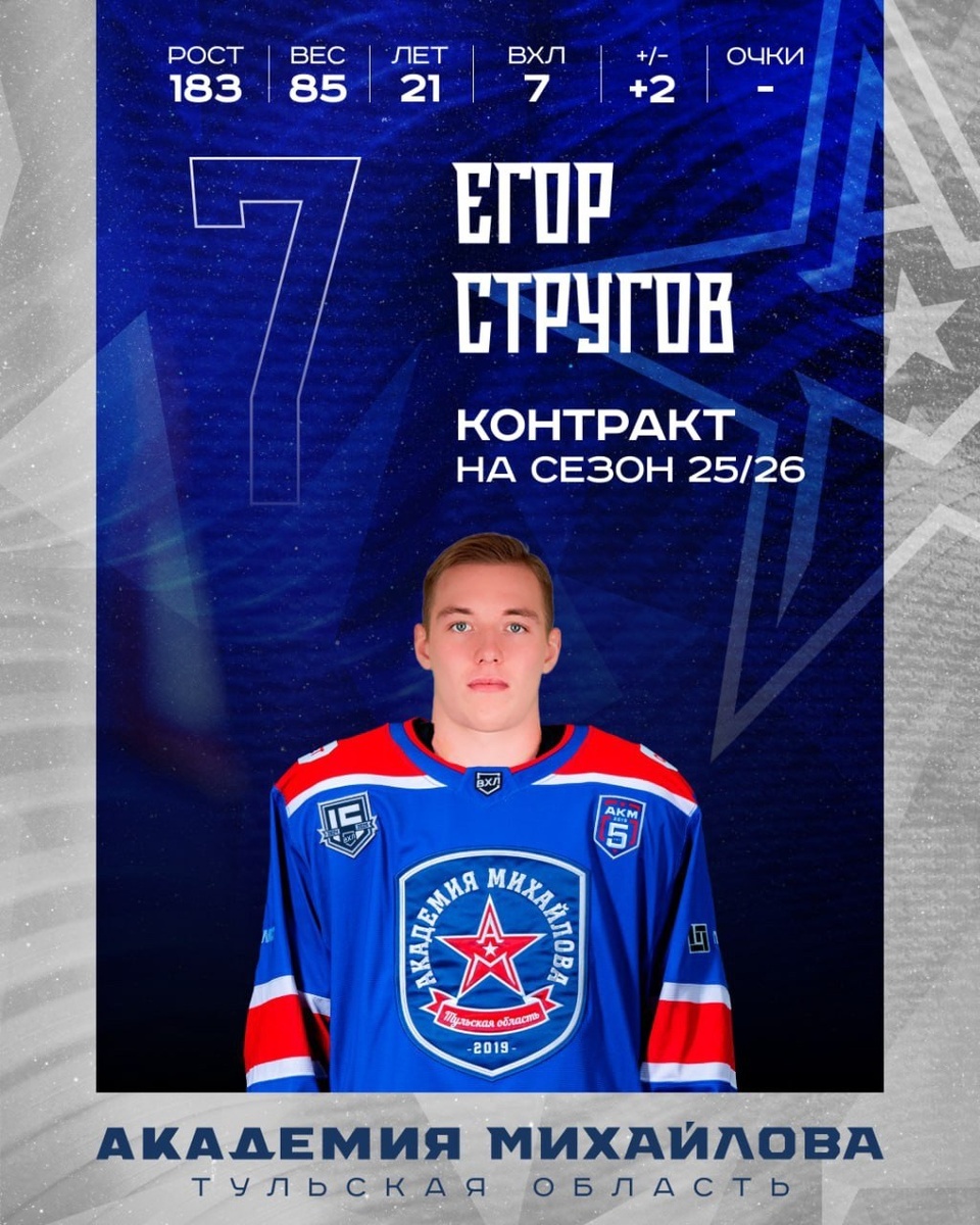 📰Новости ВХЛ ↔Егор Стругов вернулся в АКМ Защитник Егор Стругов продолжит карьеру в АКМ. Ранее он играл за тульскую «Академию Михайлова» в МХЛ на протяжении трех сезонов. На его счету 101 матч и 10 (5+5) набранных очков. 21-летний воспитанник челябинского хоккея минувший сезон провел в самарском ЦСК ВВС, в составе которого дебютировал на уровне ВХЛ. В активе игрока 7 матчей при коэффициенте полезности «+2». 📸Хоккейный клуб АКМ @nhockey