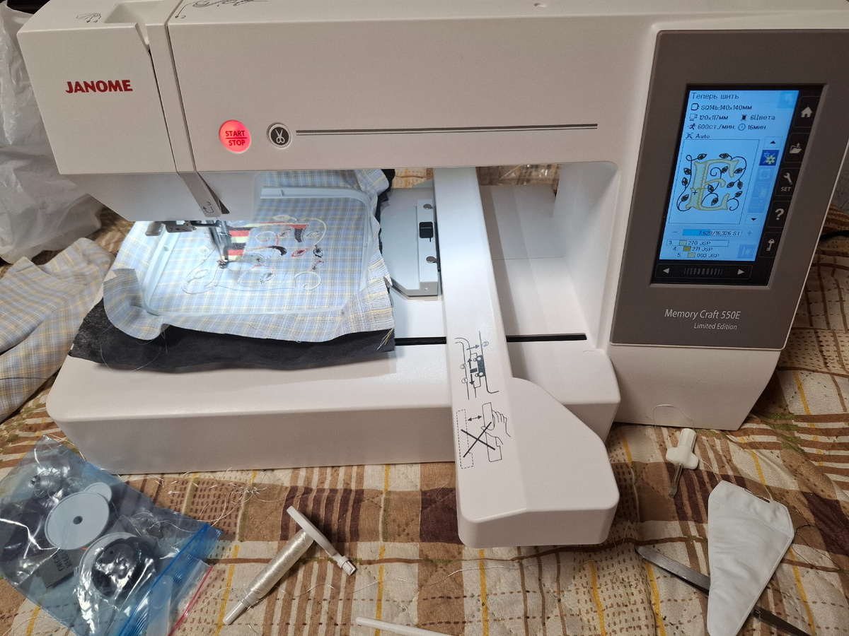 Это не техника дошла, Это я ее купила вернее муж подарил. И вот она моя очередная красавица Джаномочка Memory Craft 550e ! Давно я мечтала о такой вышивальной машине. Эмоций море, но еще больше "?и почему? и куды тут тыкать". К моему большому удивлению информации не так уж и много. А разбираться нужно. На момент почти двухнедельного знакомства отшито совсем немного, вопросов все больше и больше. Информации мало или очень дорого (то что относится к вышивальным программам). Но давайте все по порядку. В этой статье хочу собрать немного свои мысли в кучу. Машина проста в использовании. Это третья моя швейная машина данной фирмы. Первой старушке уже 12 лет и никаких нареканий. Не ломалась, были проблемки но их я устранила самостоятельно. Вторым был оверлок, тут уж пришлось немного повозится. Парень с характером! Но стоит найти к нему подход и все происходит как по волшебству. Все что касается технической части, всё есть в инструкциях, причем в очень подробных с картинками. Но дальше все