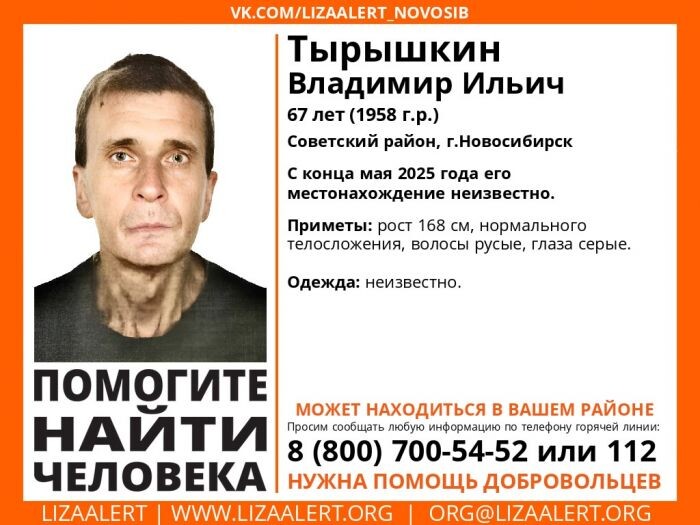 Пожилой мужчина пропал в Советском районе Пожилой мужчина пропал в Советском районе Новосибирска, о нем ничего не известно больше месяца, сообщили в воскресенье волонтеры поисково-спасательного отряда «ЛизаАлерт». https://academ.info/news/incidents/47699/