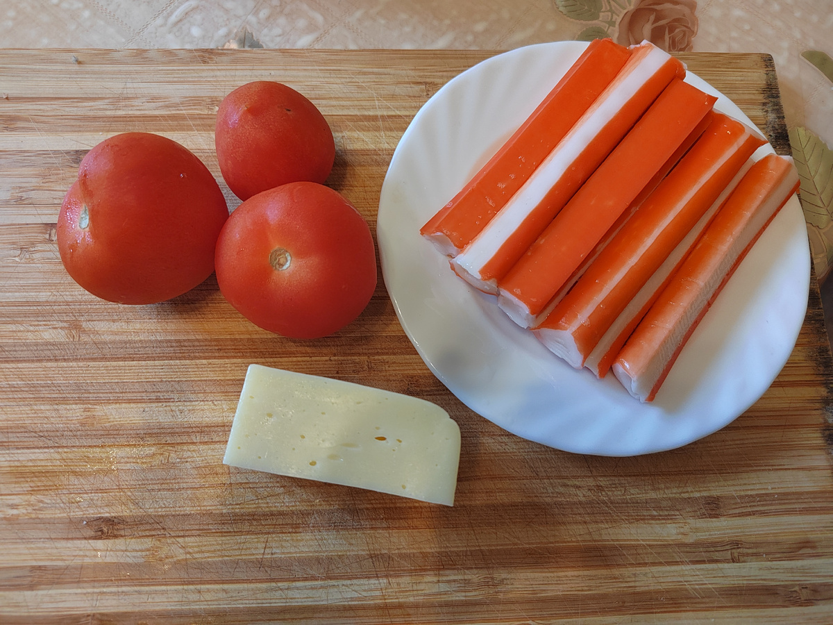 Сегодня мы с вами приготовим вкусный и быстрый салат из 3 ингредиентов! Итак, что нам понадобится : При желании можете добавить в салат чеснок! Давайте начинать готовить! Это займёт всего 5 минут! 2. Нарезаем кубиком сыр. У меня Российский. 3. Помидоры режу кубиком. Слегка отжимаю сок. 4. Смешиваем все ингредиенты. Заправляем майонезом! И наслаждаемся! Приятного аппетита!