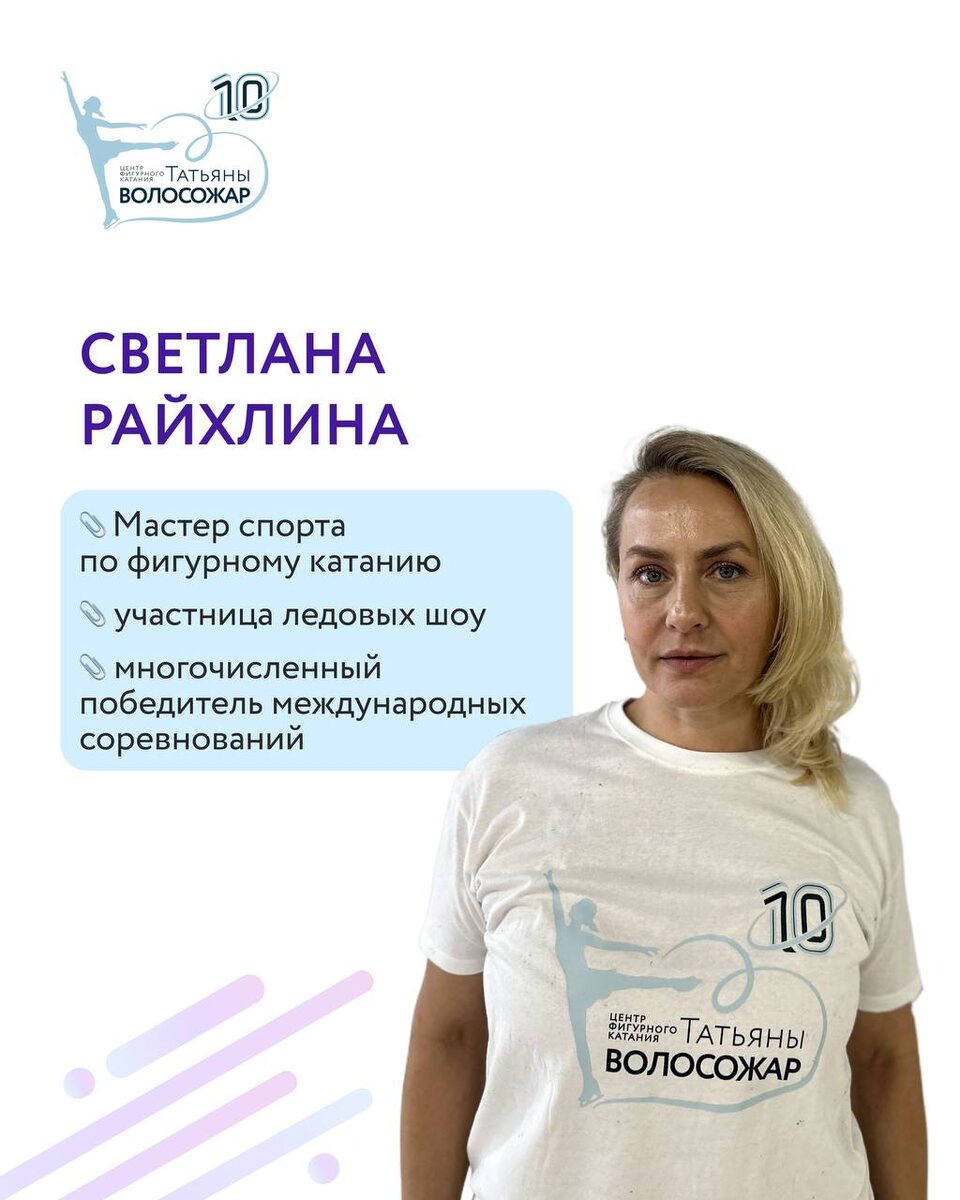 ТРЕНЕРСКИЙ СОСТАВ МОСКВА 19-29 ИЮЛЯ 📍ЛД «Сокольники» Райхлина Светлана Вячеславовна - Мастер спорта по фигурному катанию Воспитанница сильнейших школ страны, участница юниорской сборной СССР. - Многократная победительница всероссийских и международных соревнований. - Опыт международных ледовых шоу Выступала в знаковых постановках Russian Stars on Ice, The Phantom of the Opera on Ice, Moscow on Ice — опыт артистизма и катания на мировом уровне. Силкина Дарья Ивановна 🥇 Победительница международных стартов Словения, Австрия, Италия, Германия — золото на Skate Celje, Coppa Europa, Bavarian Open и других. 🇷🇺 Призёр российских турниров Медали на соревнованиях ЦСКА, «Самарочка», первенствах Москвы. 🌍 Опыт международных выступлений 10 лет соревновательной практики в Европе и России. Милованова Елизавета - Член сборной Москвы 2006-2012 -Победитель и призер чемпионатов Москвы - призер этапов кубка России - Мастер Спорта в одиночном катании Храмова Владислава Александровна (специалист п