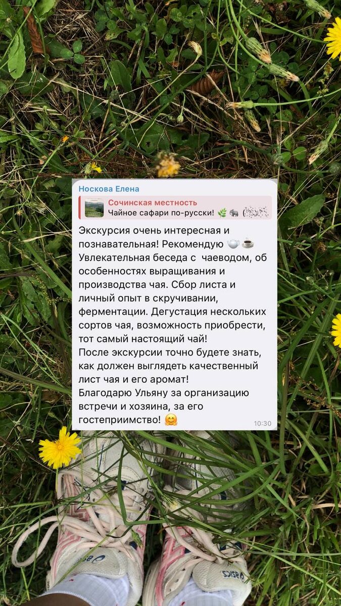 Пользуясь утром - приглашаю завтра в гости к потомственному чаеводу, почвоведу и просто хорошему человеку Когда? 08.06 (вторник) Во сколько? 10:00 Сколько? 1500 Что будет? - дегустация разных сортов чая - самостоятельный сбор чайных листьев и мк по закручиваю. Через время можно будет пить и гордиться тем, что свой ручной сбор - трансфер от Сочи, Дагомыса - рассказ про династию чаеводов - хорошая компания На всякий случай, оставляю отзыв. Вдруг кого-то замотивирует 🙃 Запись @ulianalocal #экскурсии