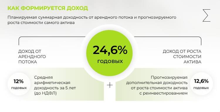 🟠Прогнозируемый рост, согласно модели УК на горизонте 5 лет, средняя годовая доходность будет 24,6%, где 12% ежемесячный купон и 12,6% рост тела.