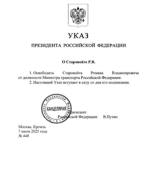 Реакция незамедлительно последовала «Освободить Старовойта Романа Владимировича от должности министра транспорта»: Путин отправил в отставку главу Минтранса Романа Старовойта. Коллапс в Шереметьево и Пулково в выходные и вот реакция. 🇷🇺 Николай Стариков → Школа @nstarikov_bot Геополитики