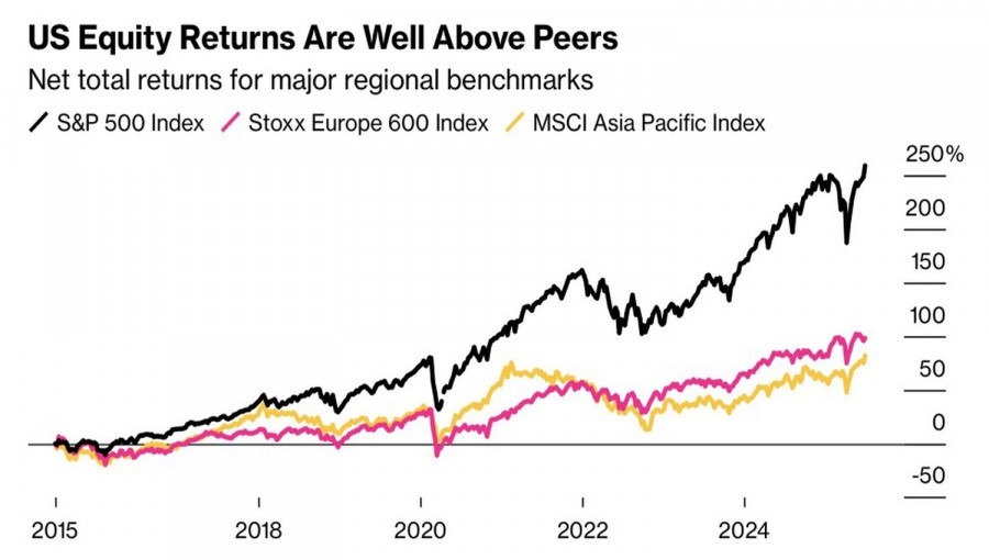 https://basechop.ru/wordpress/?p=49543 Неопределенность – враг инвестиций. Но не в 2025. Двойная неопределенность из-за геополитики и тарифов Белого дома не помешала S&P 500 установить несколько рекордных максимумов. И путь на север для широкого фондового индекса на этом не заканчивается. Новая отсрочка в пошлинах на импорт подогревает глобальный аппетит к риску. Отступление Белого дома от военной поддержки Европы повысило градус геополитических рисков. Однако Старый Свет понял, что если сам себе не поможешь, никто не поможет. Германия и ЕС развязали кошельки, и немецкие фискальные стимулы на €500 млрд стали ключевым фактором взлета евро и опережающей динамики европейских и мировых фондовых индексов над S&P 500 в 2025. EuroStoxx 600 и MSCI есть куда расти. Инвесторы это прекрасно понимают. Динамика S&P 500, EuroSoxx 600 и мирового рынка акций Однако улучшение европейского и мирового спроса на акции хорошо и для США. Американский рынок является самым крупным в мире. Доля эмитированны