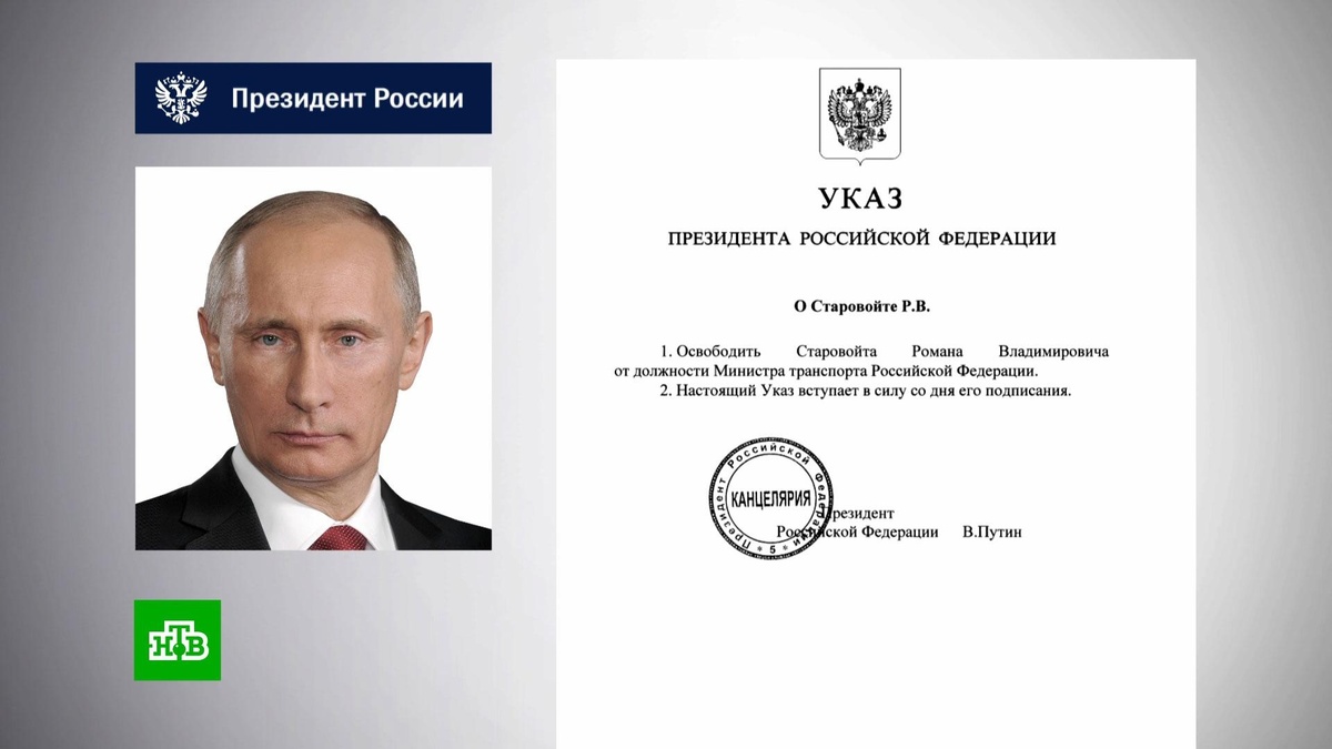 [ Смотреть видео на сайте НТВ ] Владимир Путин освободил министра транспорта Романа Старовойта от занимаемой должности. Указ президента об этом опубликован на портале правовой информации. «Освободить Старовойта Романа Владимировича от должности министра транспорта Российской Федерации», — говорится в документе. Роман Старовойт был назначен министром транспорта 14 мая прошлого года. До этого он был губернатором Курской области. Напомним, в мае этого года Владимир Путин освободил от должности заместителя главы МЧС России Илью Денисова. Также от должности был освобожден замглавы ФСИН РФ Александр Хабаров. [ Смотреть видео на сайте НТВ ]