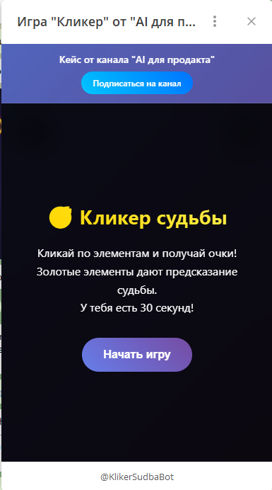 Брендинг: В шапке игры добавить текст "Кейс от канала 'AI для продакта'". Кнопка "Подписаться на канал" со ссылкой https://t.me/aiforproduct
