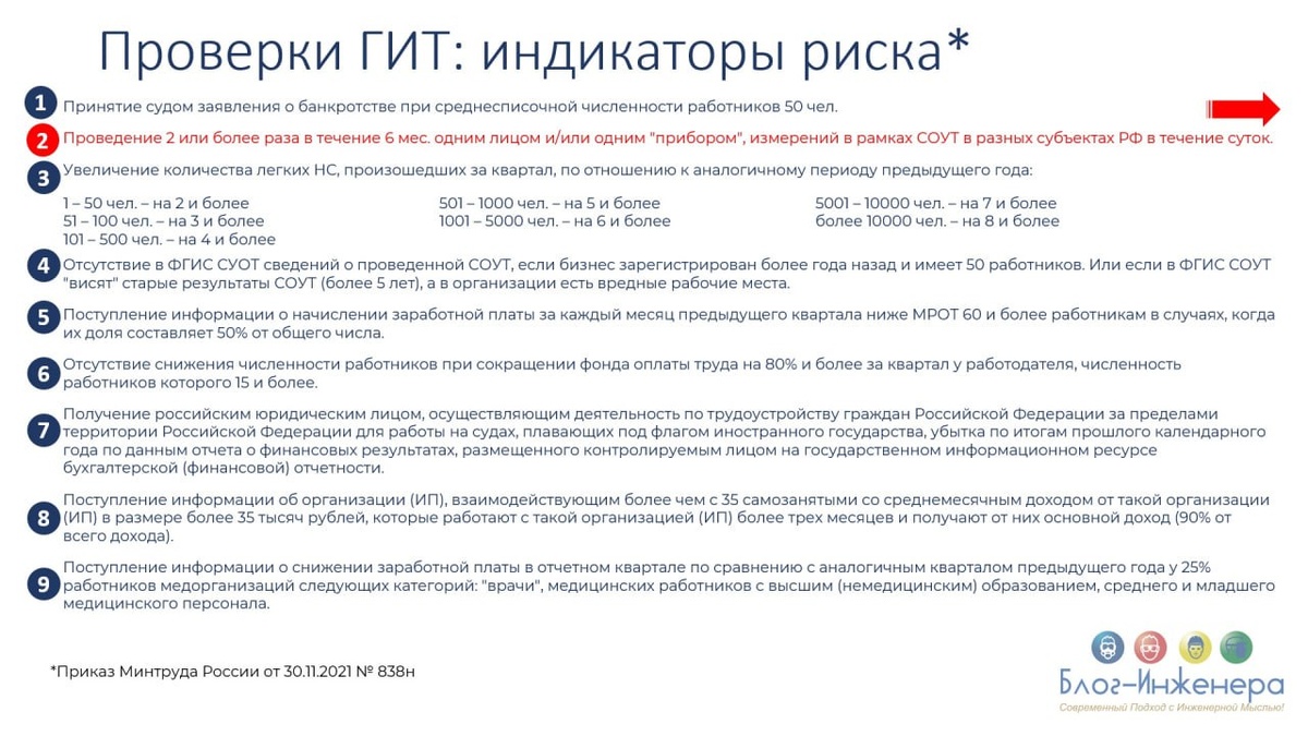 Проверки ГИТ: скорректировали индикатор риска для ОПСОУТ ℹ️ Приказом Минтруда России от 05.06.2025 № 356н внесены изменения в пункт 2 Перечня индикаторов риска нарушения обязательных требований при осуществлении федерального государственного контроля (надзора) за соблюдением трудового законодательства и иных нормативных правовых актов, содержащих нормы трудового права, утверждённого Приказом Минтруда России от 30.11.2021 № 838н. Листайте наши карточки, в них всё наглядно показано! Блог—Инженера для тебя ❤️ ⭐️ СУОТ 📍 Услуги