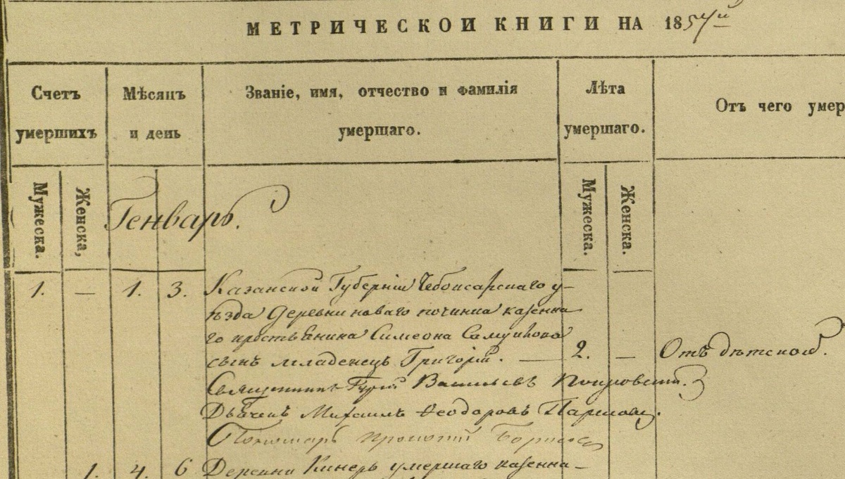 1. мужеска пола. умер 1 числа. отпет 3 числа. Казанской губернии Чебоксарского уезда деревни Нового починка казённого крестьянина Симеона Самуилова сын младенец Григорий. 2 лет.
