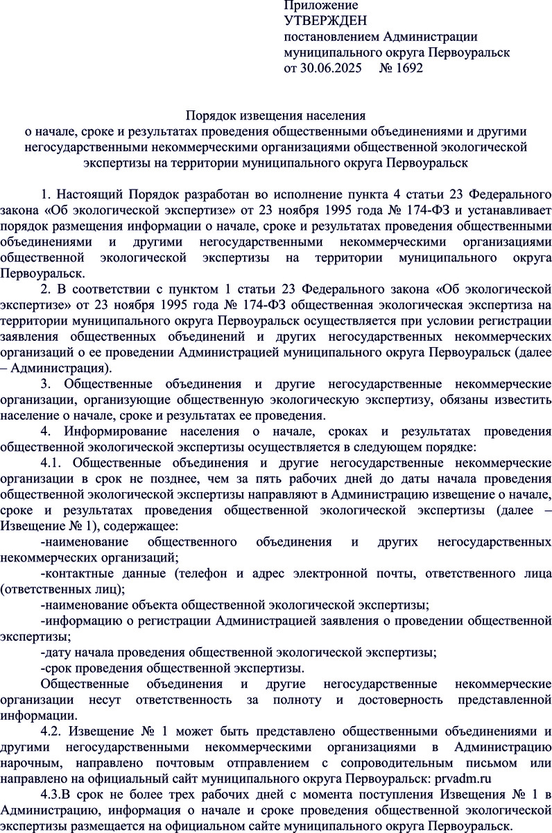 Мы уже собирались подать закономерную апелляцию на данное решение, как с удивлением обнаружили, что администрация Первоуральска постановлением №1692 от 30.06.2025 (через 3 дня после окончания последнего суда) оперативно разработала и опубликовала «Порядок извещения населения о начале, сроке и результатах проведения общественными объединениями и другими негосударственными некоммерческими организациями общественной экологической экспертизы на территории муниципального округа Первоуральск.»