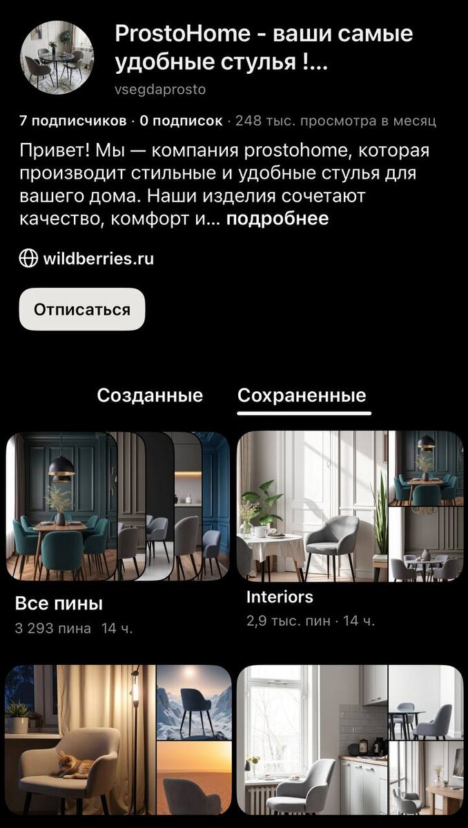 2. Визуализация: Пользователь сохраняет наш пин ( или сразу переходит по нему в магазин ), мысленно «примеряя» этот стиль на свою квартиру. Он уже не просто ищет «серый стул», он ищет «тот самый стул из скандинавского интерьера, который я видел».