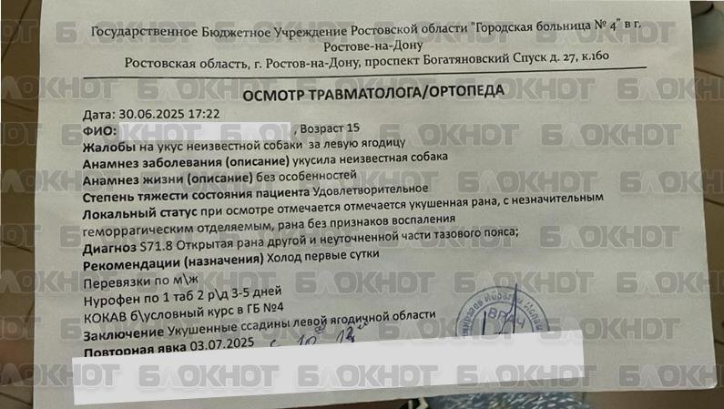 – Мы проживаем в ЖК Платовский, ул. Художественная, 20 – рядом школа 85. В тот день, 30 июня, моя дочка была на вручении аттестатов, после чего мы с ней поехали в колледж. Она была в легком тоненьком платье после мероприятия. А когда возвращались домой, в 15:00, возле подъезда на нас нападают две собаки. Нам почти удалось от них отбиться, но одна собака все-таки смогла укусить мою дочь, – рассказала ростовчанка. Женщина добавила, что эти собаки не в первый раз ведут себя агрессивно. Ранее они уже кусали трех человек, и все пострадавшие обращались в службу по отлову собак. – Как я знаю, в нашем доме живет бабушка, которая возле дома кормит бродячих собак. В тот день, когда мою дочь укусили, нам просто не повезло – мы подходили к подъезду в тот момент, когда она выходила с едой. В службе отлова собак сотрудники говорят, что самую агрессивную собаку привозили уже неоднократно. Вот только ее привозят и потом кто-то сразу же выкупает ее, оплатив минимальный штраф. Я бы написала заявление