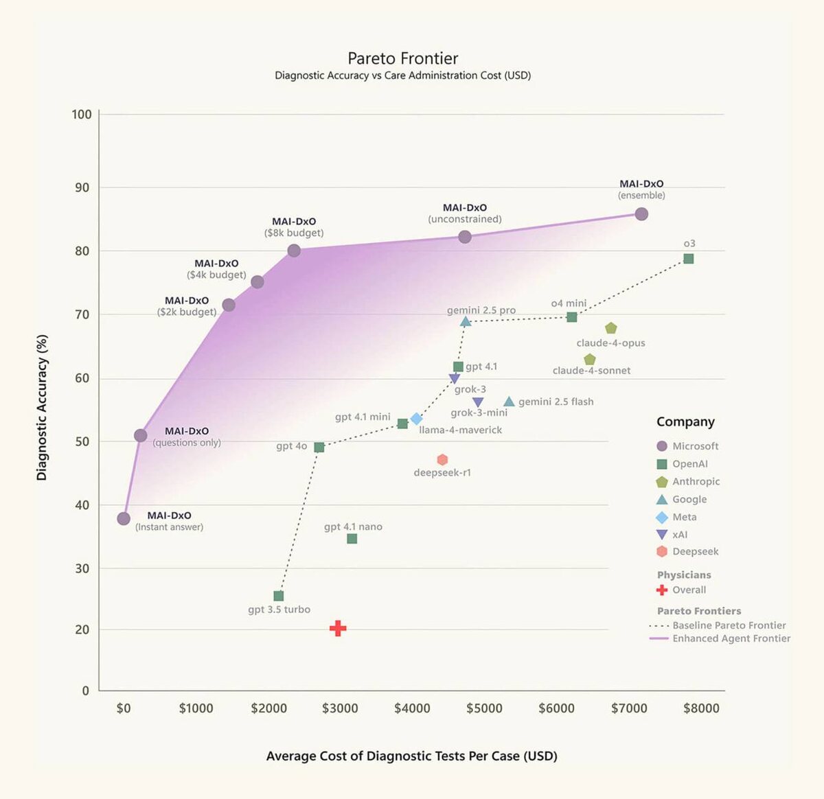 🩺 ИИ поставил диагнозы точнее врачей — исследование Microsoft Microsoft решила проверить, насколько современные нейросети могут помогать врачам в диагностике. Для эксперимента использовали 304 сложных клинических случая из международного медицинского журнала. В испытании участвовали 21 практикующий врач из США и Великобритании, а также ИИ-модели от OpenAI, Google, Anthropic и других лидеров рынка. Эксперимент проходил в формате интерактивного чата, где участники могли “общаться” с виртуальным пациентом. Главное нововведение — “ИИ-консилиум”: команда из нескольких нейросетей обсуждает диагноз так же, как это делают настоящие врачи на совместных консультациях. Результаты впечатляют: — Врачи правильно ставили диагноз только в 20% случаев — Одиночные ИИ — в 78% — “ИИ-консилиум” — в 85,5%! Абсолютным лидером стала модель o3 от OpenAI. ИИ не просто догоняет врачей, а уже начинает их превосходить — особенно когда работает “командой”. Именно такие ИИ-консилиумы скоро станут новым стандар