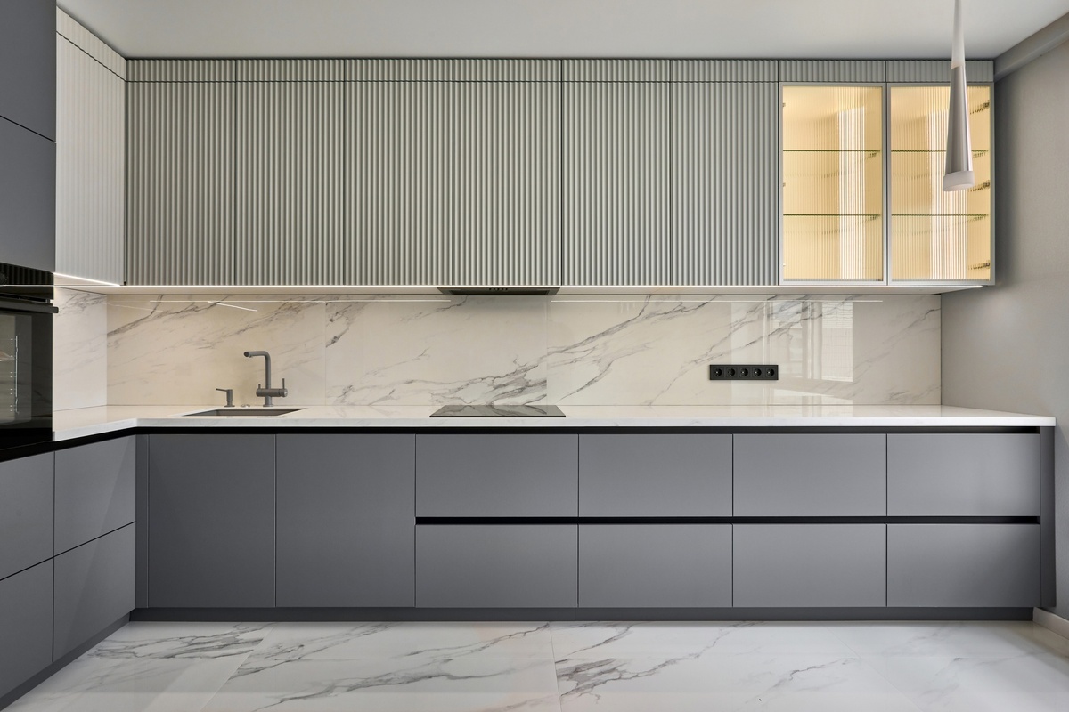 Стекло Мору — это узорчатое стекло с прозрачным вертикальным рисунком и рифленой поверхностью. Подходит для установки в алюминиевую рамку, витрины МДФ с пленкой и краской, а так же двери-купе. Толщина — 4 мм, размер полотна — 2440х1830 мм. Шаг полосок на стекле — 10 мм. Характеристики проекта: Корпус: ЛДСП Egger W1000 Белый премиум Фасад: AGT Pebble Grey 3024 Фасад: МДФ эмаль RAL 9010 Белый Фасад: узкая алюминиевая рамка стекло Moru Фурнитура: Ящики Hettich innotech atira, петли с доводчиками Hettich Обсудить проект и вызвать дизайнера (https://t.me/kitchen_tsekh)