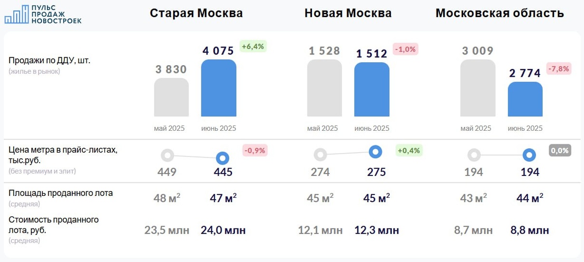 Подводим итоги июня в Москве и области. Как можно оперативнее информировали вас об итогах июня по готовности у нас данных в эти выходные, теперь сводная. Старая Москва — продажи выросли на 6,4%, 4 075 ДДУ. Средняя цена на конец июня 445 тысяч рублей (-0,9%) Новая Москва — снижение продаж на -1,0%, 1 512 ДДУ. Средняя цена на конец июня 275 тысяч рублей (+0,4%) Московская область — снижение продаж на -7,8%, 2 774 ДДУ. Средняя цена на конец июня 194 тысячи рублей 🔥 @pulsprodaj