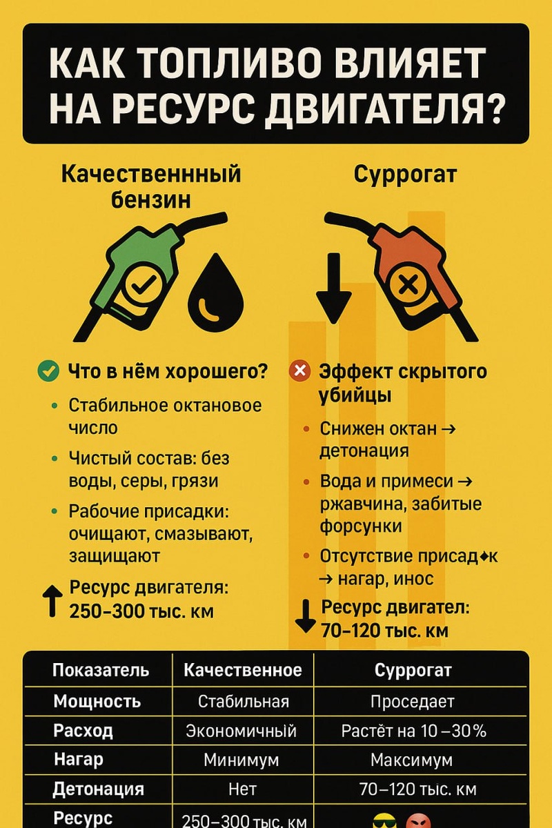 ⚙️ Как топливо влияет на ресурс двигателя? Бодяга убивает. Качественный бензин — продлевает жизнь. ⛽️💀 Если вы всё ещё выбираете заправку по принципу "где на 2 рубля дешевле", то этот пост для вас. Потому что топливо — это не просто средство движения, а главный фактор здоровья вашего двигателя. ✅ Качественный бензин — как хорошее питание 🔹 Стабильное октановое число 🔹 Чистый состав: без воды, серы, грязи 🔹 Рабочие присадки: очищают, смазывают, защищают 📈 Результат: – ровная тяга – нормальный расход – минимум нагара – ресурс двигателя до 300 000 км ❌ Суррогат — скрытый убийца мотора 🔻 Снижен октан → детонация 🔻 Вода и примеси → ржавчина, забитые форсунки 🔻 Отсутствие присадок → нагар, перегрев, износ 📉 Результат: – двигатель троит – турбина "просится на пенсию" – катализатор плавится – капиталка через 70 000 км 💸 Сэкономили 200 рублей → отдали 120 000 ₽ на СТО. 🔬 Таблица: качественное VS суррогат Параметр Качественное Суррогат Мощность стабильная проседает Расход